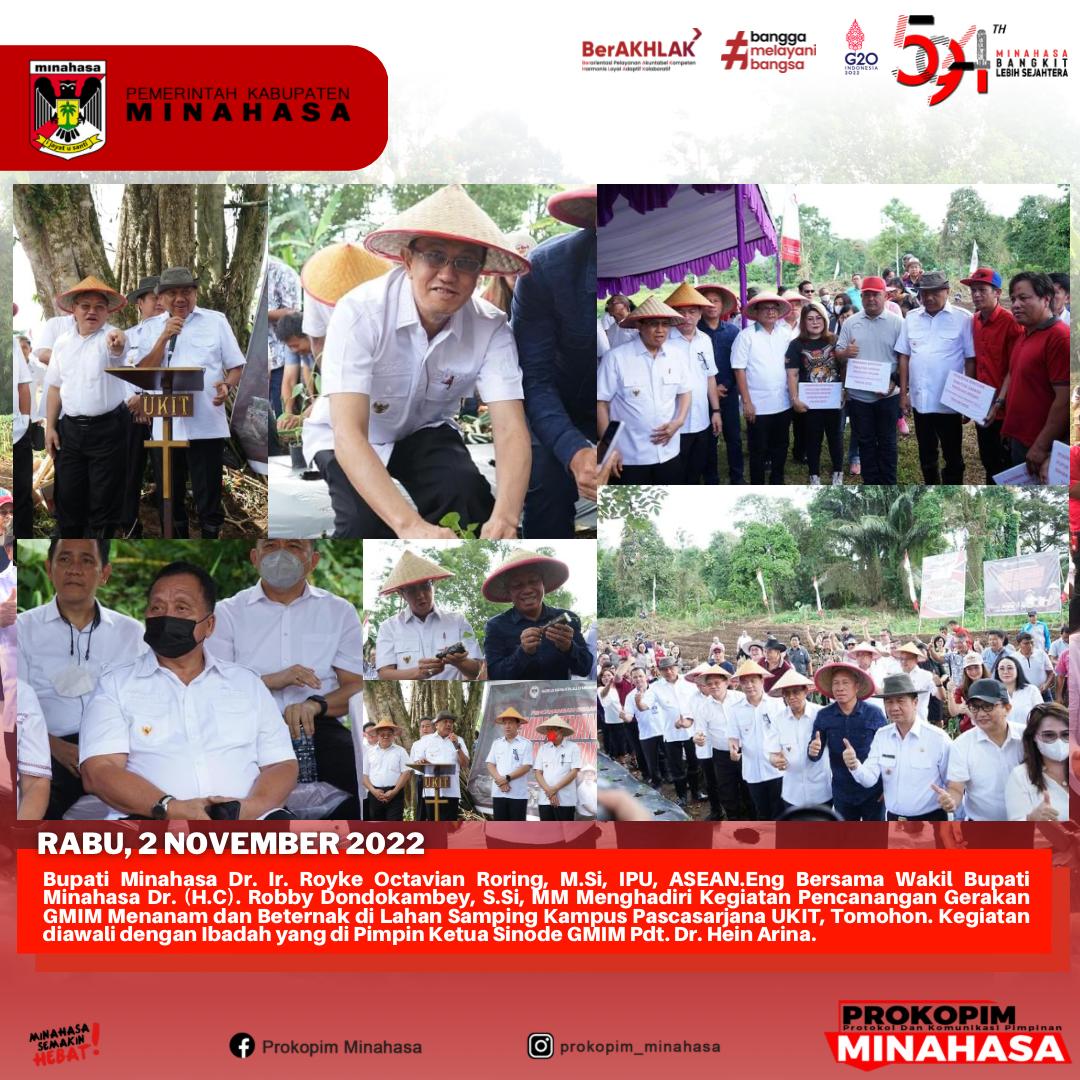 Pilarportal.com, Minahasa – Bupati Minahasa Dr. Ir. Royke Octavian Roring, M.Si, IPU, ASEAN.Eng Bersama Wakil Bupati Minahasa Dr. (H.C). Robby Dondokambey, S.Si, MM Menghadiri Kegiatan Pencanangan Gerakan GMIM Menanam dan Beternak di Lahan Samping Kampus Pascasarjana UKIT, Kelurahan Kakaskasen Kecamatan Tomohon Utara. Rabu (02/11/2022).