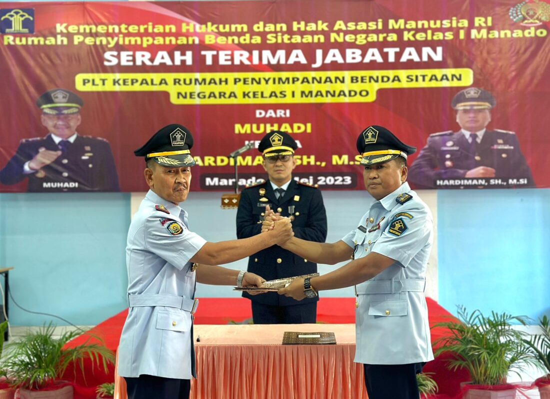 Pilarportal.com — Manado – Kepala Kantor Wilayah Kementerian Hukum dan HAM Sulawesi Utara Ronald Lumbuun memimpin acara serah terima jabatan Kepala Rumah Penyimpanan Barang Sitaan Kelas I Manado dari pejabat yang lama Muhadi kepada pejabat yang baru Hardiman sebagai Pelaksana Tugas Kepala Rumah Penyimpanan Barang Sitaan yang dilaksanakan di aula Lapas Manado, Selasa (02/05).