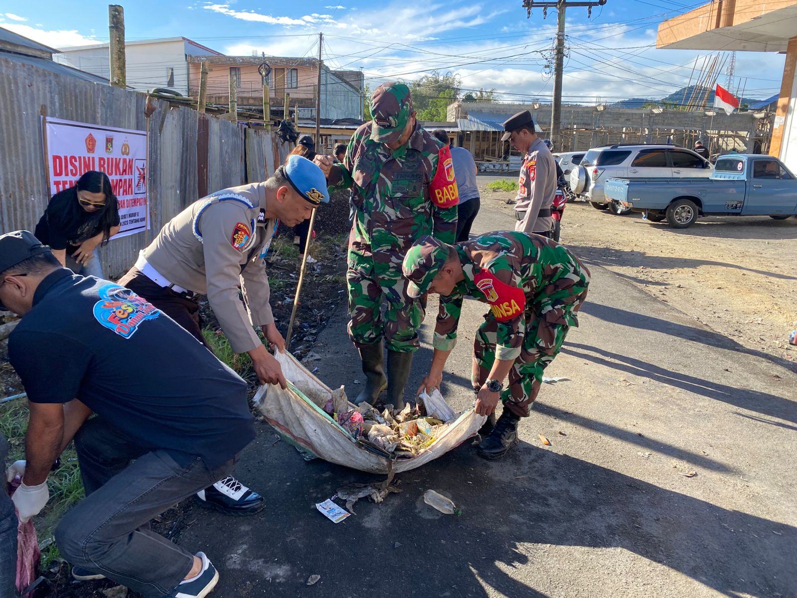 Usai apel, personel gabungan langsung membersihkan sampah di sepanjang jalan serta selokan di kompleks Pasar Baru Langowan menggunakan peralatan kebersihan.