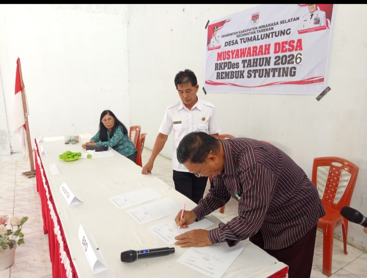 PilarPortal.com–Minsel-Pemerintah Desa Tumaluntung Kecamatan Tareran Kabupaten Minsel menggelar Musyawarah Desa (Musdes) pada hari rabu 6 Agustus 2025, dalam rangka penyusunan Rencana Kerja Pemerintah Desa (RKPDes) Tahun Anggaran 2026, juga penetapan APBDes Perubahan 2025. Kegiatan yang berlangsung di Kantor Desa Tumaluntung dihadiri oleh berbagai unsur penting, seperti tokoh masyarakat dan Sekdes Tumaluntung dan Perangkat Desa, Ketua dan Anggota BPD, Pendamping desa, Babinsa, Bhabinkamtibmas, Bidan Desa, Ketua TP-PKK, Ketua LPM, Ketua Ormas Desa, Linmas, dan pengurus KPM.