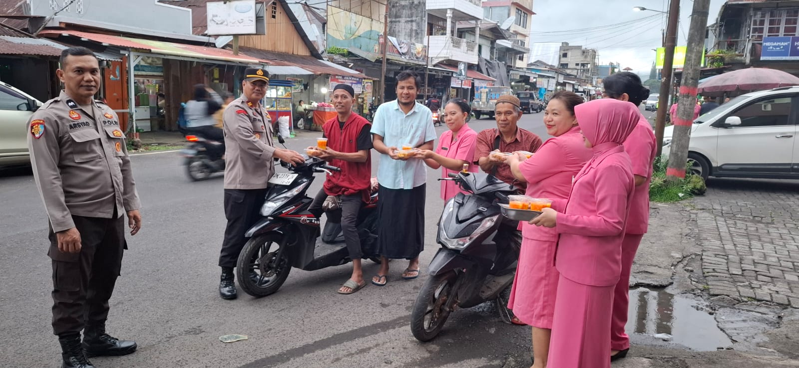 Foto Dok: (Kapolsek Langowan IPTU Edi Asri, S.H., bersama Ketua Bhayangkari Ranting Langowan, Ibu Vonny Edi Asri, S.H., serta diikuti oleh anggota Polsek Langowan dan Bhayangkari Ranting Langowan saat bagikan Takjil kepada masyarakat).