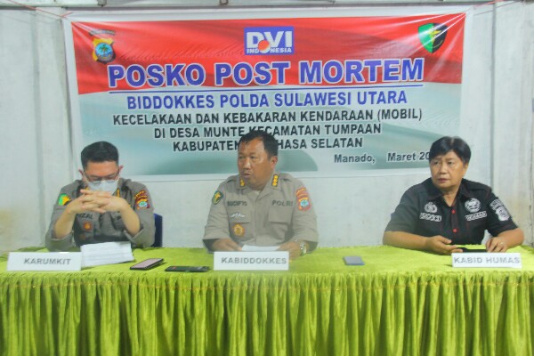 Hal tersebut disampaikan Kabid Dokkes Polda Sulut Kombes Pol dr. Sucipto didampingi Kepala Rumah Sakit Bhayangkara Tingkat III Manado AKBP dr. F. Zulkarnaen dan Kaur Penum Subbid Penmas Bidang Humas Polda Sulut Kompol Selfie Torondek, saat konferensi pers di Posko Post Mortem Bidang Dokkes Polda Sulut, Kamis (9/3/2023) sore.