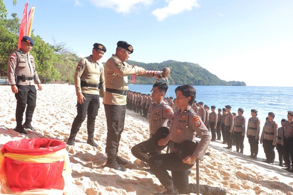 Pilarportal.com — Manado – Kapolda Sulawesi Utara (Sulut) Irjen Pol Setyo Budiyanto memimpin upacara penutupan tradisi pembaretan bintara remaja Direktorat Samapta Polda Sulut, pada Jumat (10/3/2023), di Pantai Paal Likupang Timur, Kabupaten Minahasa Utara.