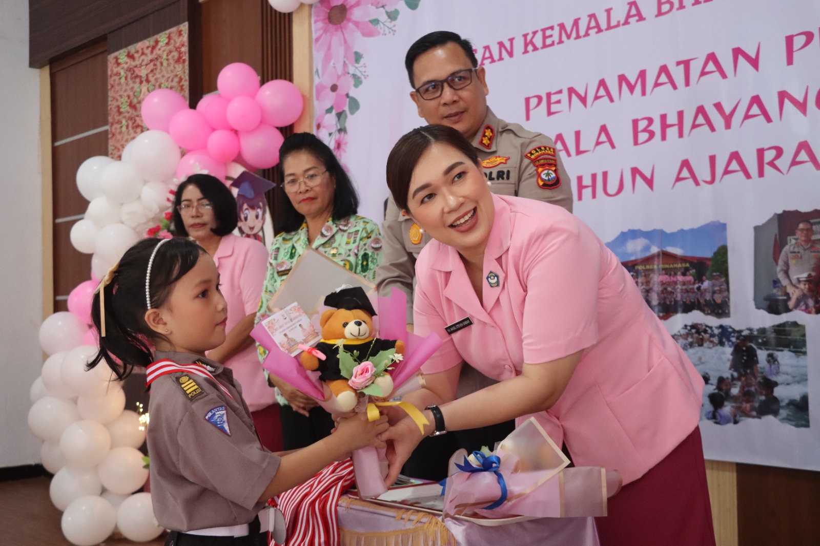 Momen puncak acara berlangsung haru saat Kapolres Minahasa AKBP Steven J.R. Simbar, S.I.K., didampingi Ketua Bhayangkari Cabang Minahasa Ny. Angel Steven Simbar, menyerahkan bingkisan penamatan kepada setiap peserta didik.
