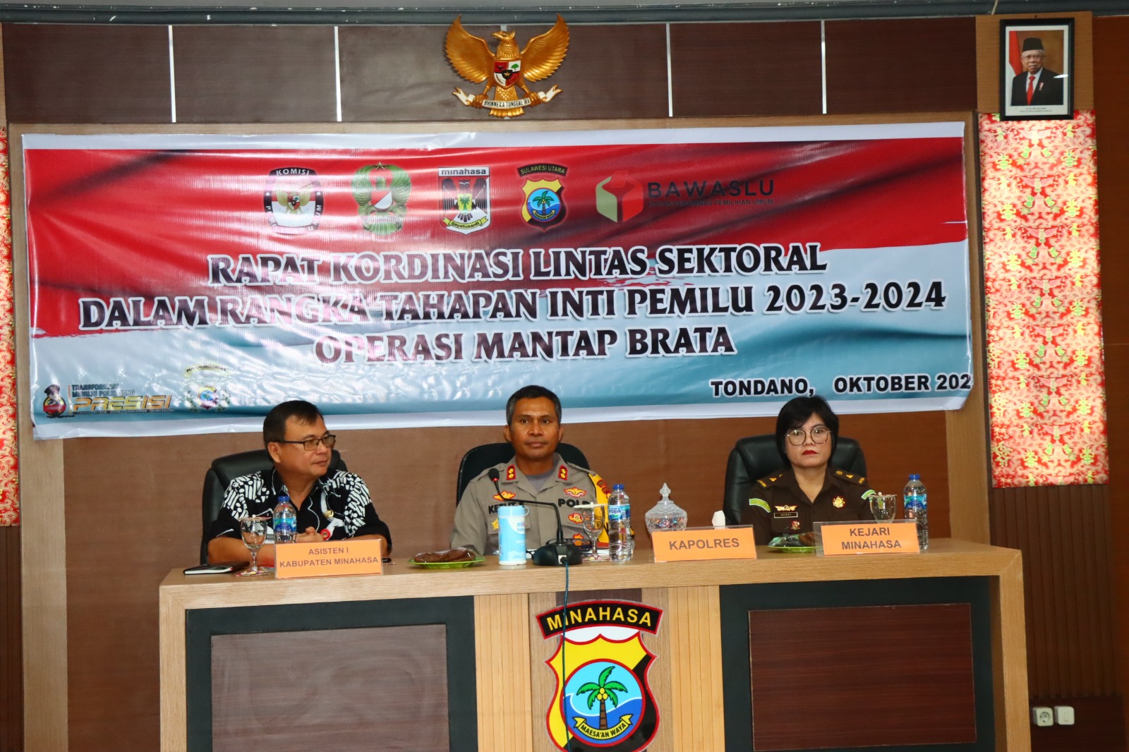 Pilarportal.com, Minahasa. Kapolres Minahasa AKBP Ketut Suryana SIK.,SH.,MM, memimpin rapat koordinasi lintas sektoral dalam rangka tahapan inti pemilu 2023-2024 di Ruangan Maesa Polres Minahasa, Kamis (12/10/2023).