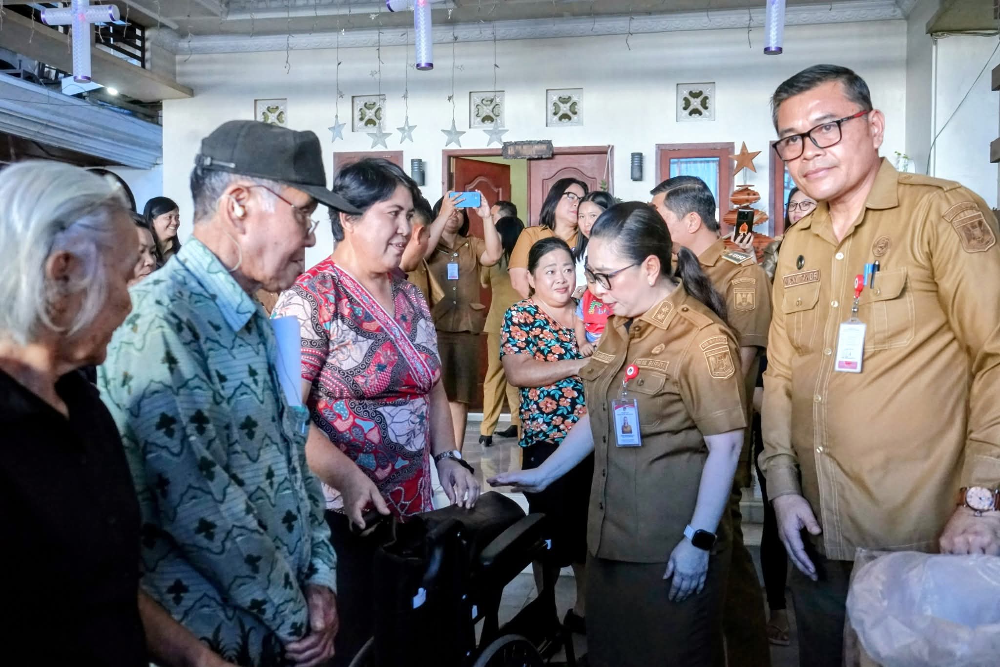 Di akhir kegiatan, Wabup Vanda menyerahkan bantuan sosial berupa kursi roda dan bantuan pangan kepada masyarakat.