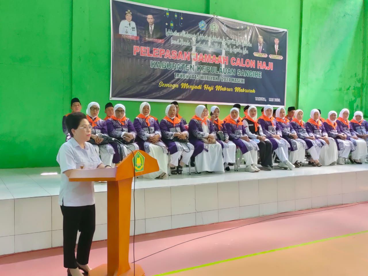Sangihe-Pilarportal.com-Penjabat (Pj) Bupati Kabupaten Kepulauan Sangihe, dr. Rinny Tamuntuan melepas keberangkatan 27 Jamaah Calon Haji yang berasal dari Kabupaten Kepulauan Sangihe.