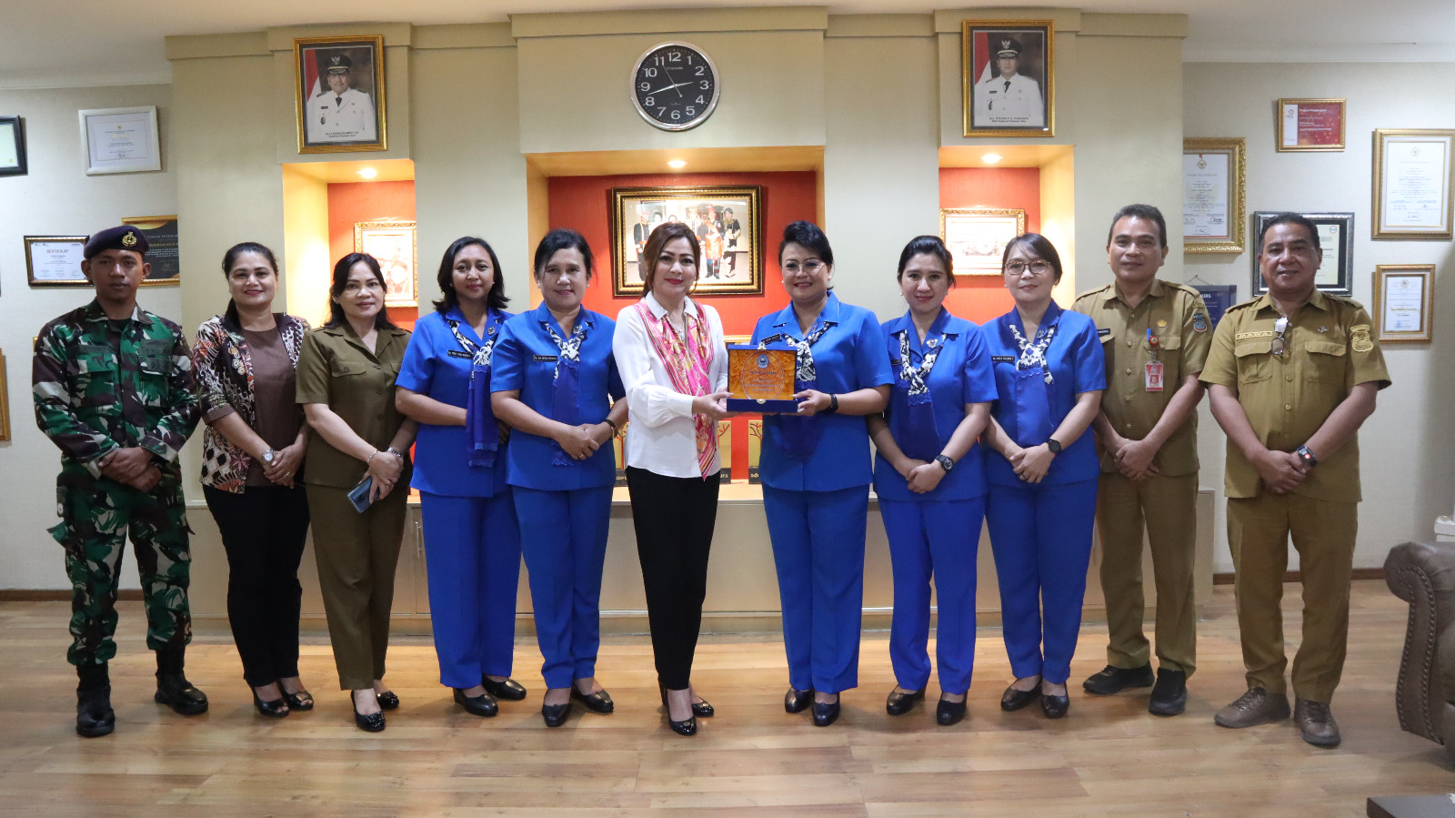 Kunjungan kerja tersebut disambut langsung Ketua PKK Kota Manado Ny. Irene G. Angouw Pinontoan, bersama Kadisperindag Kota Manado Hendrik Waroka dan Sekretaris Dektranasda Ibu Jetty Mukuan.