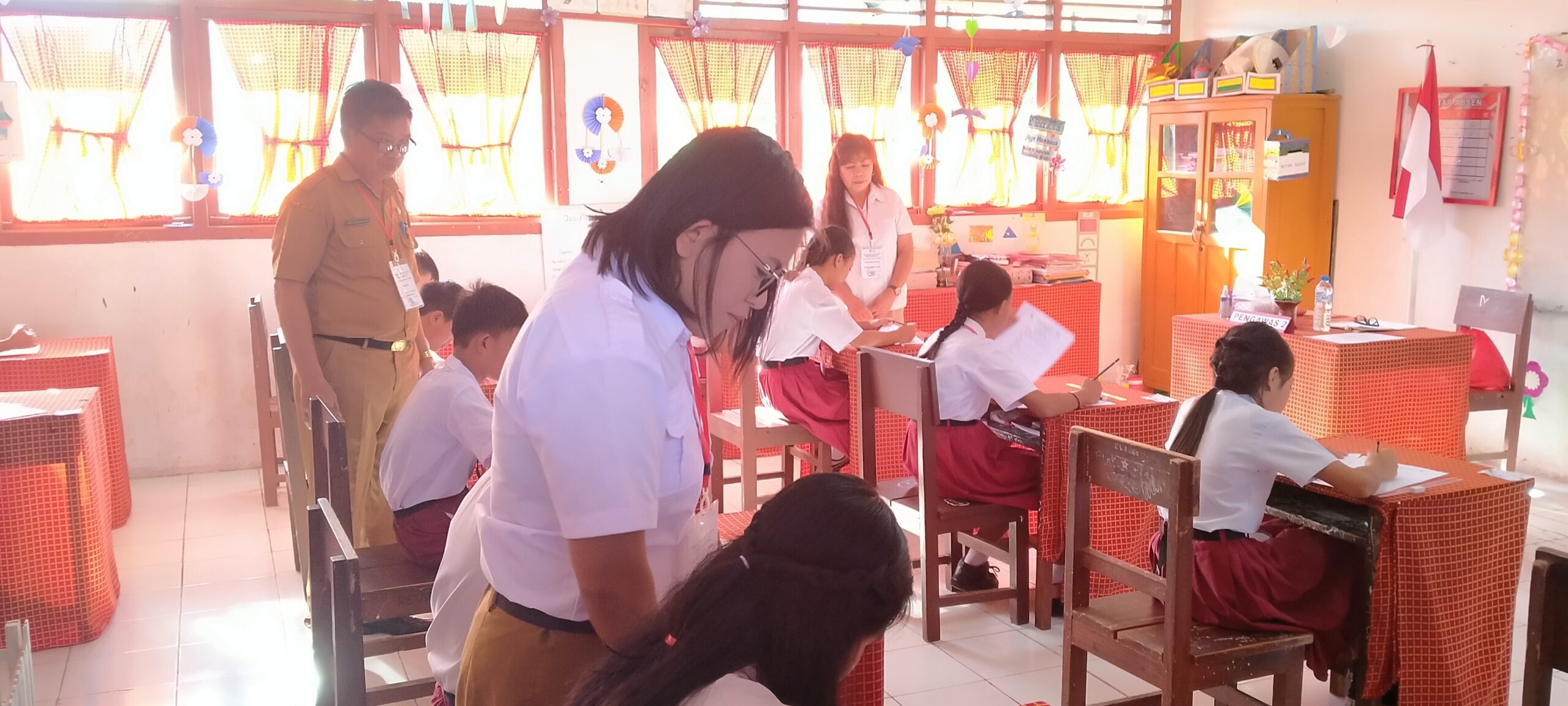 Kegiatan tersebut diawali dengan pembukaan soal ujian di depan 16 murid kelas VI oleh kepala sekolah Feber Tamuntuan S.Pd bersama dua pengawas yakni Ester Kowel S.Pd.k, Lilia Piri S.Pd.