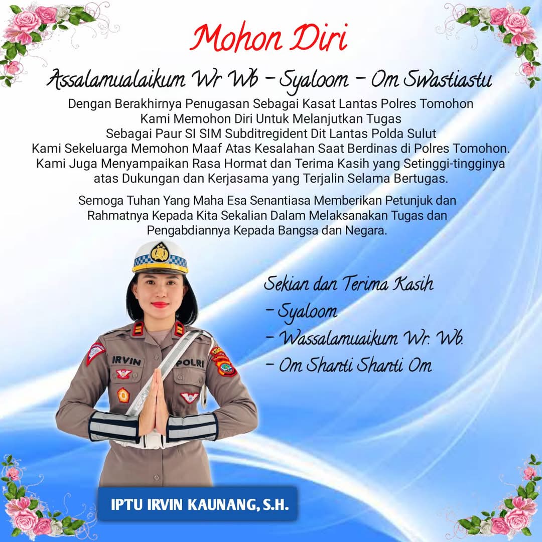 Sehubungan dengan berakhirnya masa tugas sebagai Kasat Lantas Polres Tomohon, perkenankan saya mohon diri disertai ucapan terima kasih dan penghargaan atas segala bantuan, dukungan dan kerjasama yang telah terjalin dengan baik selama ini.