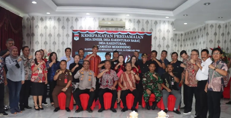 Pilarportal.com – Minsel – Pemerintah desa, tokoh masyarakat, tokoh agama Desa Sinisir dan Desa Kakenturan Raya (Desa Kakenturan dan Desa Kakenturan Barat), Kec. Modoinding, Kab. Minahasa Selatan (Minsel), resmi menandatangani kesepakatan perdamaian, Kamis (16/02/2023).