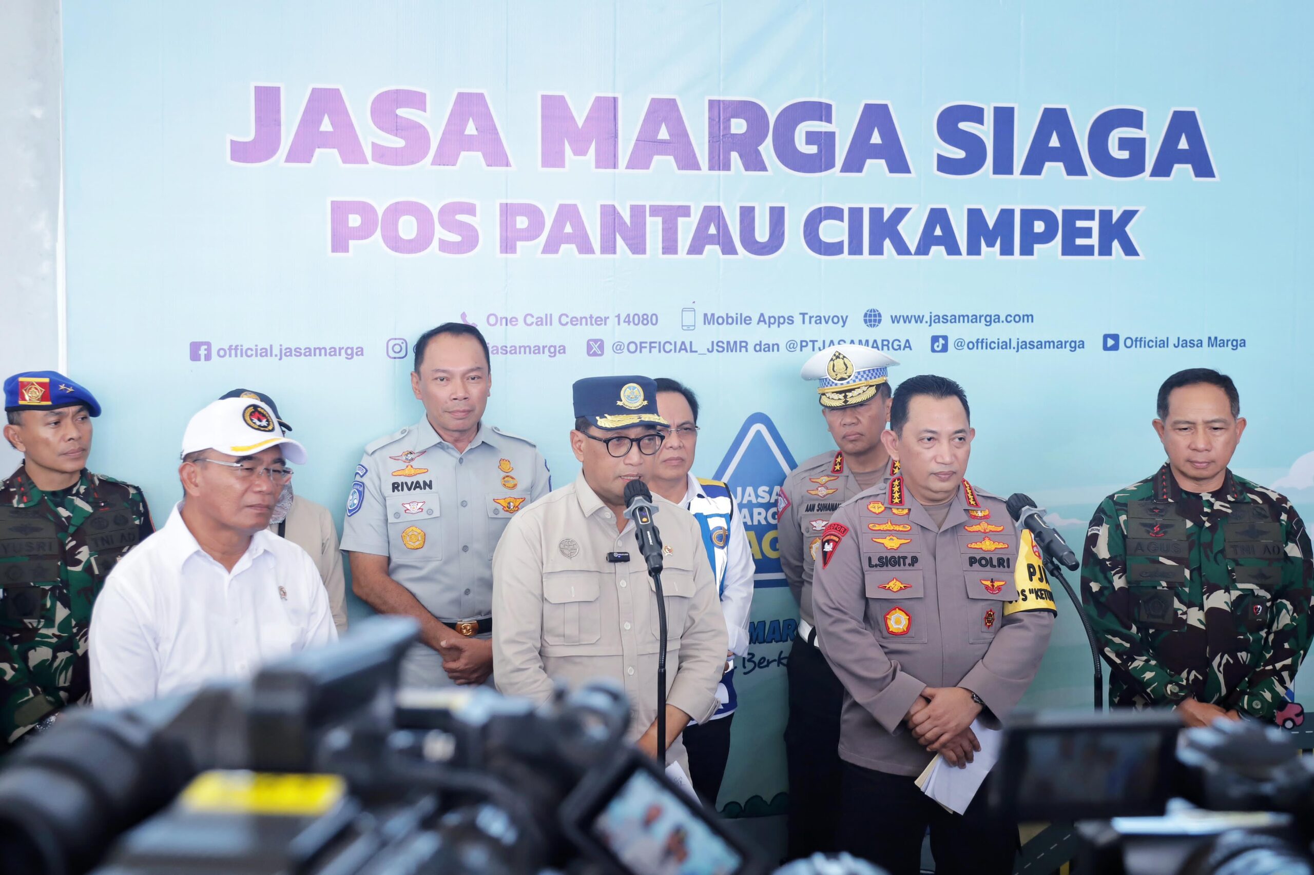 Kapolri Drs. Listyo Sigit Prabowo, M.Si., Panglima TNI Jenderal TNI H. Agus Subiyanto, S.E., M.Si., dan Kakorlantas Polri Irjen. Pol. Dr. Drs. Aan Suhanan, M.Si., melakukan rapat koordinasi dan evaluasi mudik dan arus balik Lebaran 2024 di Kantor Jasa Marga, GT Cikatama Km 70, Senin (15/04/2024).