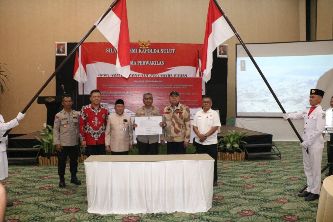 Silaturahmi tersebut dirangkaikan dengan penandatanganan naskah Deklarasi Pemilu Damai 2024 oleh para tokoh dan Kapolda Sulut.