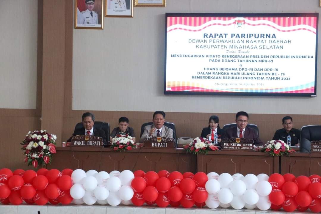 Pilarportal.com, Minsel – Dewan Perwakilan Rakyat Daerah (DPRD) Kabupaten Minahasa Selatan (Minsel) melaksanakan Rapat Paripurna Istimewa Mendengarkan Pidato Kenegaraan Presiden dalam rangka HUT Proklamasi Kemerdekaan Republik Indonesia Ke-78, Rabu (16/8/2023).