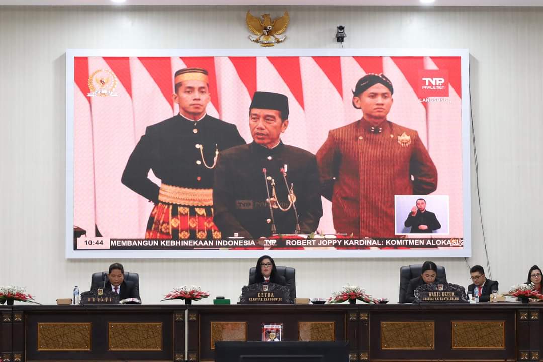 Pilaportal.com,Minahasa – Rapat Paripurna DPRD Kabupaten Minahasa Dalam Rangka Mendengarkan Pidato Kenegaraan Presiden Republik Indonesia dalam HUT – 79 Kemerdekaan RI pada Sidang Tahunan MPR RI dan Sidang Bersama DPD-RI dan DPR-RI, melalui live streaming dari Ruang Sidang DPRD Kab Minahasa, Jumat (16/08/2024) pagi.