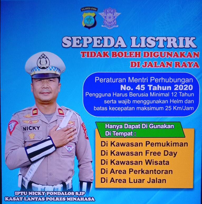 Pilarportal.com,Minahasa – Satuan Lalu Lintas (Satlantas) Polres Minahasa memberikan himbauan kepada pengguna sepeda listrik untuk tidak menggunakan kendaraan mereka di jalan raya.