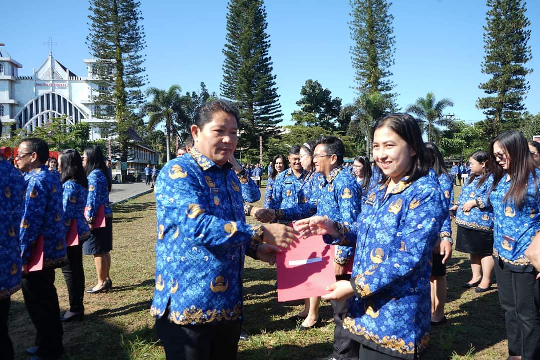 Pilarportal.com,Minahasa – Penjabat (Pj) Bupati Minahasa Dr. Jemmy Stani Kumendong M.Si, pimpin apel Korpri. Apel dirangkaikan dengan penyerahan SK Kenaikan pangkat bagi ASN, berlangsung di Lapangan God Bless Minahasa, Rabu (17/04/2024).