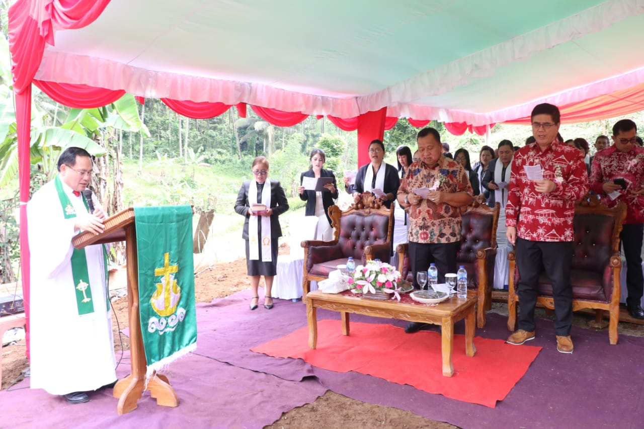 Dalam kesempatan itu usai mengikuti acara ibadah syukur, Wakil Bupati Robby Dondokambey melanjutkan peletakan batu pertama pembangunan Pastori Tiga GMIM Riedel Kembes.