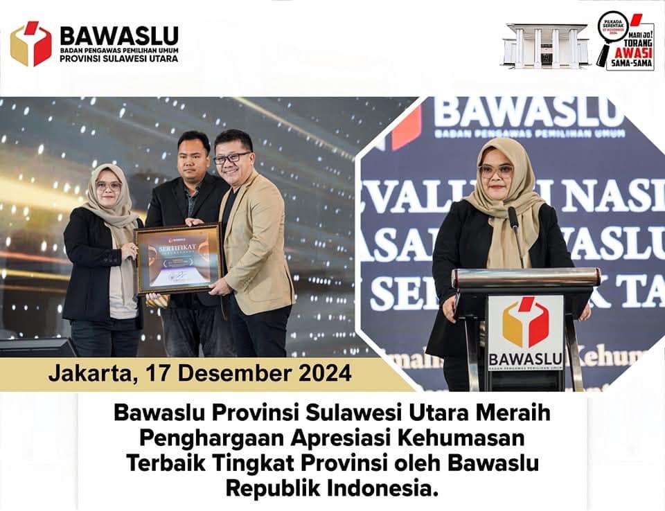 Pilarportal.com,Sulut – Bawaslu Provinsi Sulawesi Utara (Sulut) raih penghargaan apresiasi kehumasan terbaik tingkat provinsi pada pelaksanaan Pemilihan Serentak 2024 yang digelar oleh Bawaslu RI, Selasa (17/12/2024).