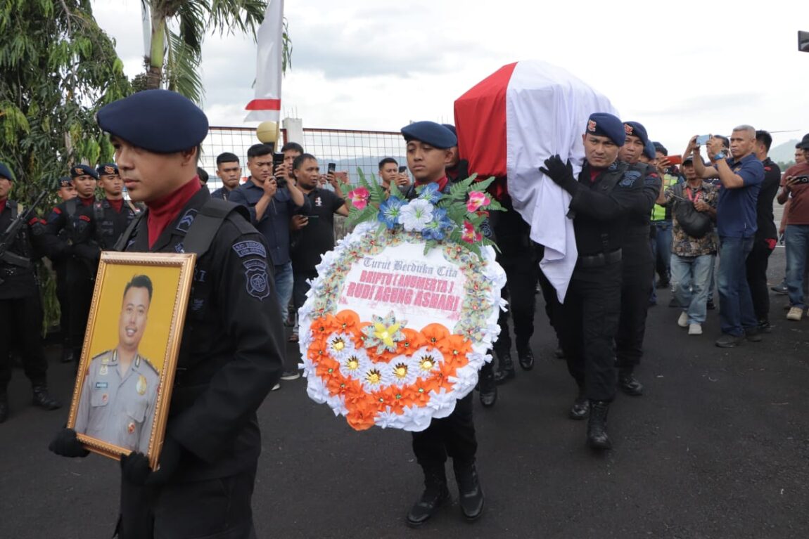 Kapolda bersama Wakapolda, Pejabat Utama, Bhayangkari, dan personel Polda Sulut, memberikan penghormatan terakhir kepada jenazah Brigpol Anumerta Rudi Agung Ashari serta menyampaikan ucapan belasungkawa kepada keluarga almarhum.