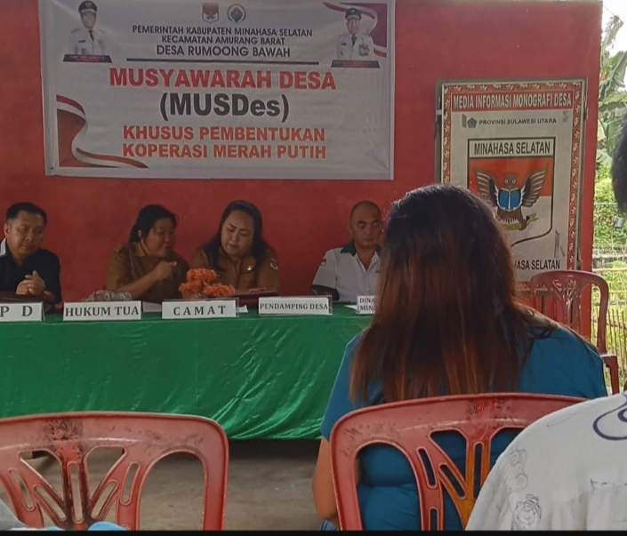 PilarPortal.com–Minsel--Pemerintah Desa (Pemdes) Rumoong Bawah satu Kecamatan Amurang barat Kabupaten Minahasa selatan melaksanakan Musyawarah Desa Khusus (MUSDESUS) untuk membentuk Koperasi Desa Merah Putih, Kamis (20/05/2025).