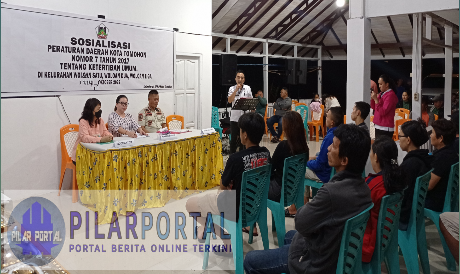 Pilarportal.com,Tomohon – Dewan Perwakilan Rakyat Daerah (DPRD) Kota Tomohon Melaksanakan Sosialisasi Perda No 7 Tahun 2017 Tentang Ketertiban Umum Bersama Unit Polisi Pamong Praja Kota Tomohon, kamis, (20/10/2022) di Kelurahan Woloan Satu, Woloan Dua dan Woloan Tiga.
