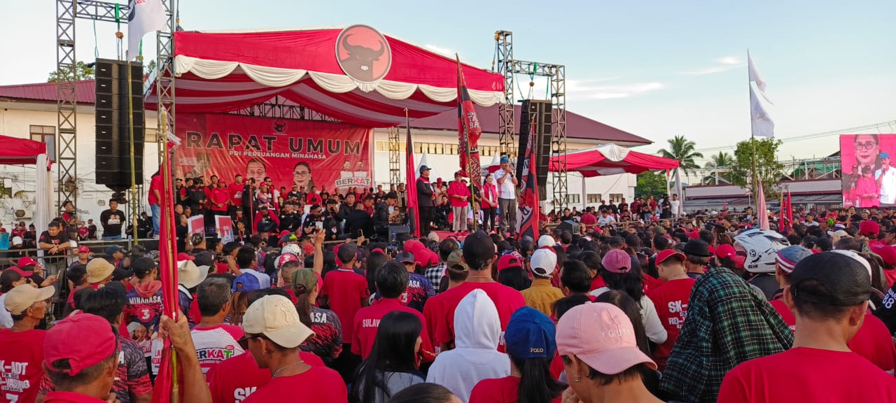 Ribuan pendukung membanjiri lapangan di belakang Kantor Bupati Minahasa untuk menyaksikan salah satu puncak kegiatan kampanye menjelang Pilkada Minahasa 27 November 2024.