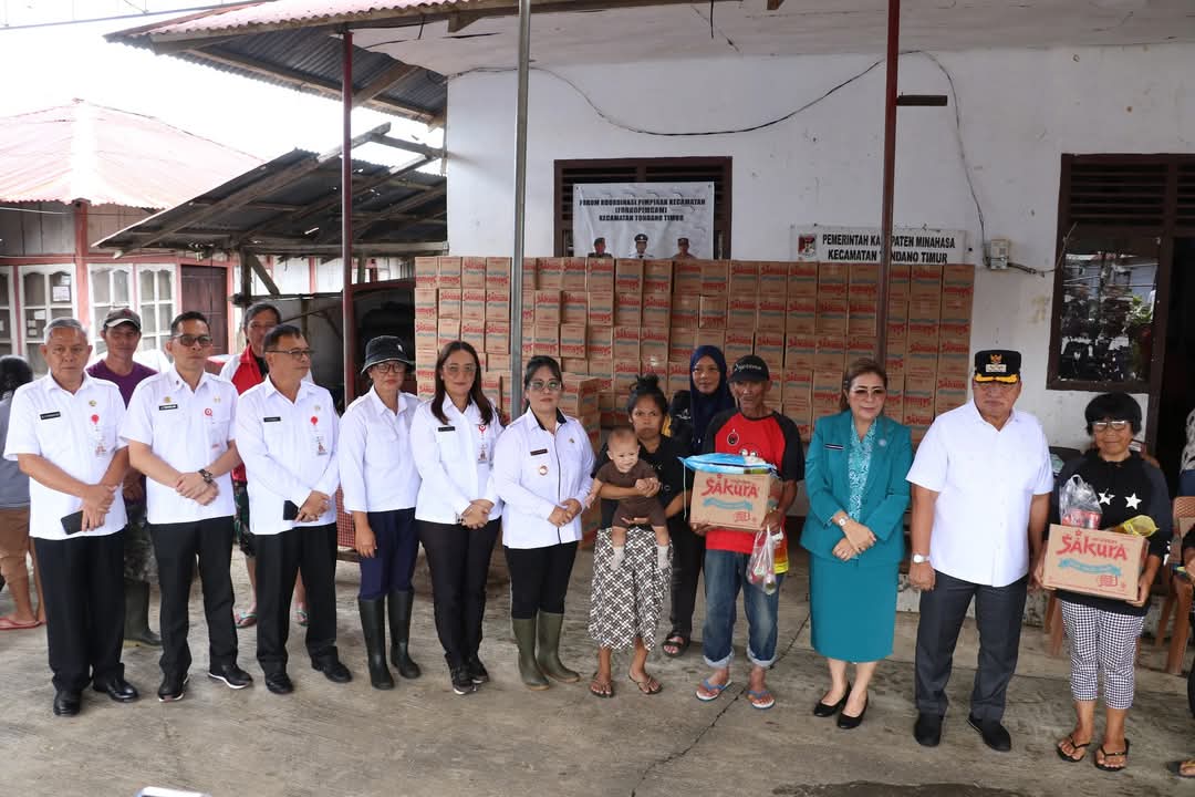 Bupati Minahasa didampingi Ketua Tim Penggerak PKK Minahasa Ny. Martina Watok Dondokambey-Lengkong, menyalurkan bantuan logistik untuk meringankan beban warga.