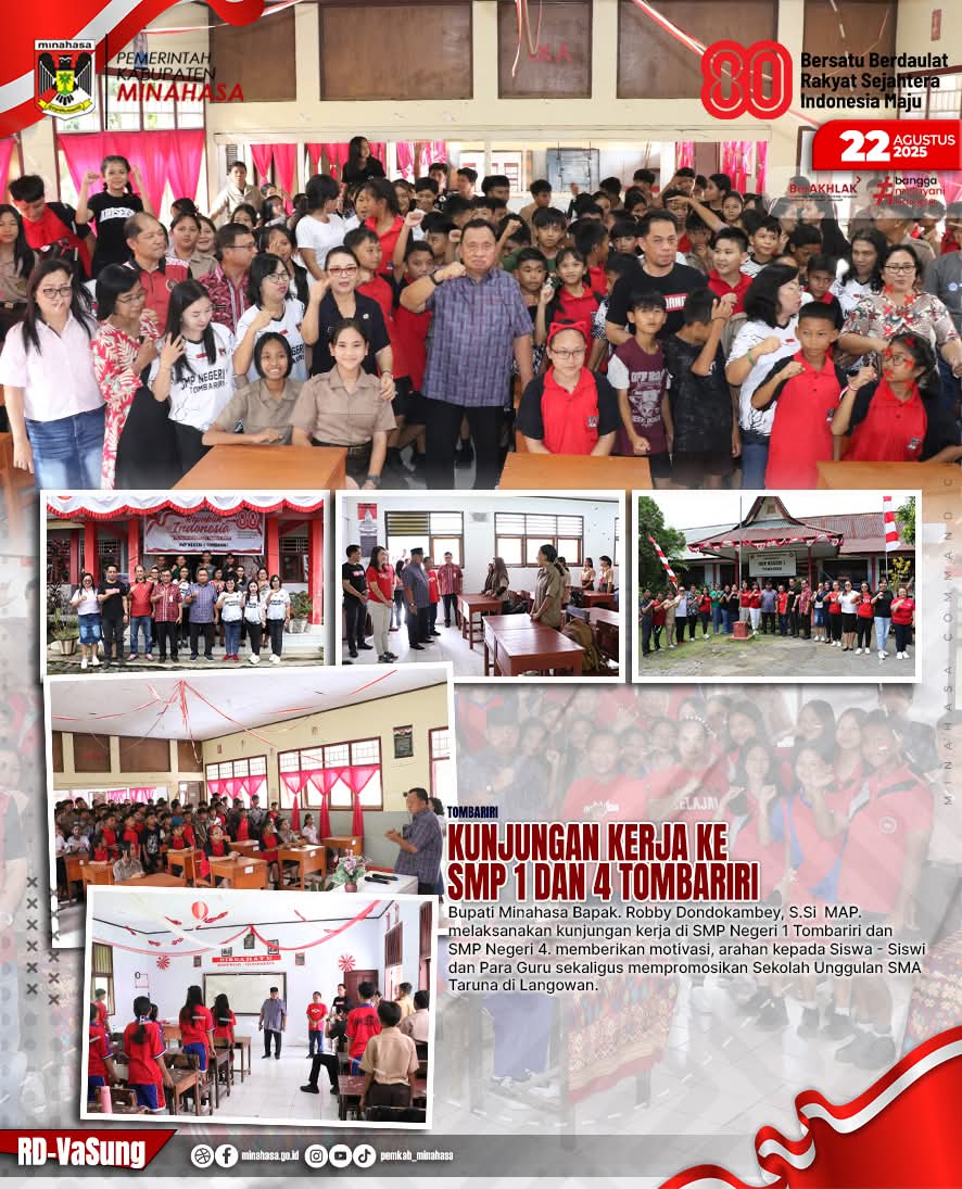 Pilarportal.com,MINAHASA – Bupati Minahasa, Robby Dondokambey, S.Si., M.A.P., melakukan kunjungan kerja ke SMP Negeri 1 Tombariri dan SMP Negeri 4 pada Jumat (22/8/2025). Dalam kesempatan tersebut, Bupati bertemu langsung para siswa serta tenaga pendidik.