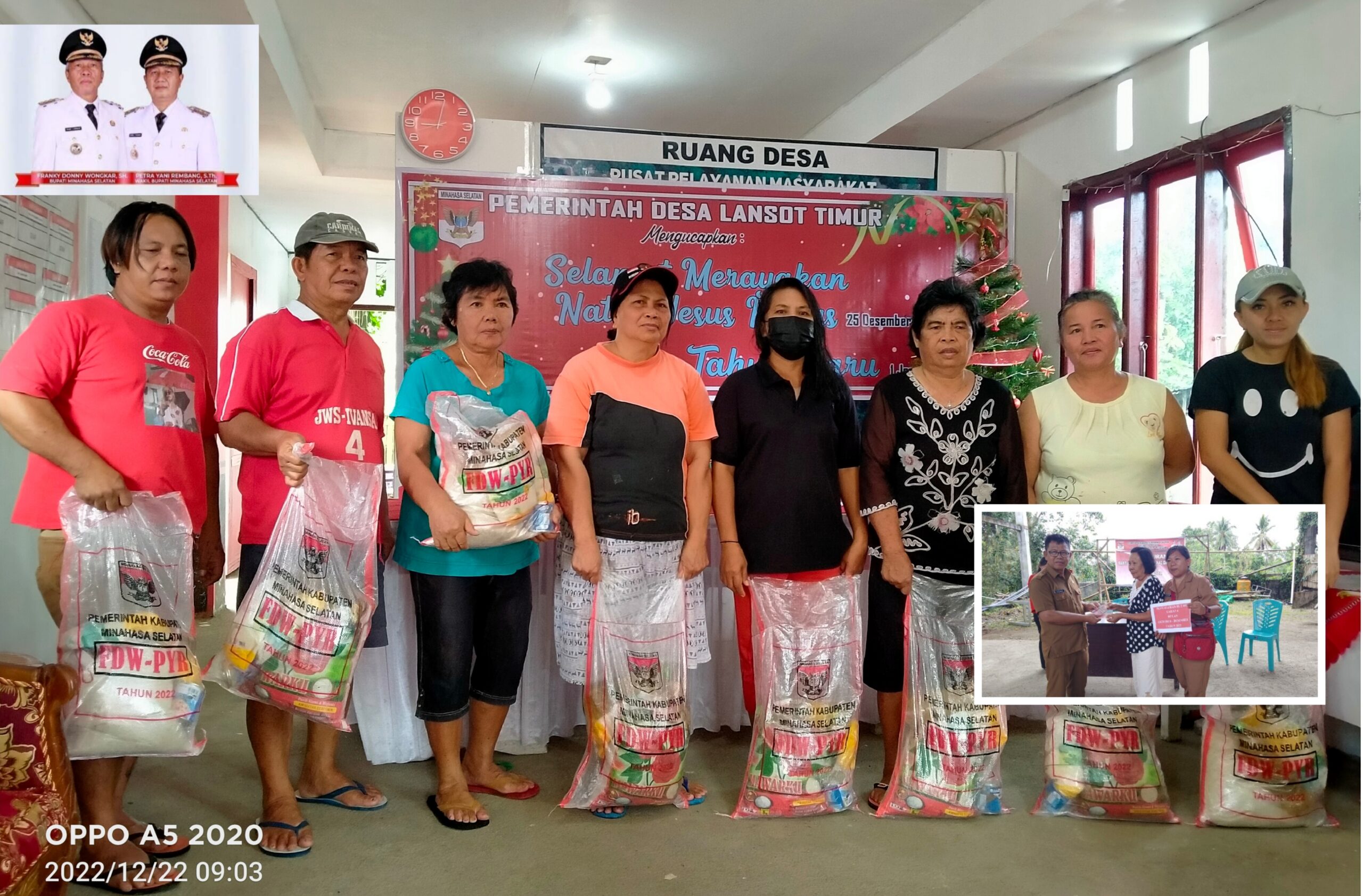 Pilarportal.com, Minsel – Realisasi penyaluran bantuan Bahan Pokok dari pemerintah kabupaten Minahasa Selatan bupati Franky Donny Wongkar SH bersama wakil bupati Pdt Petra Yani Rembang MTh terpantau hari ini Kamis (22/12/2022) disalurkan pemerintah desa Lansot Timur kepada 123 warga penerima yang berlangsung di kantor desa setempat.