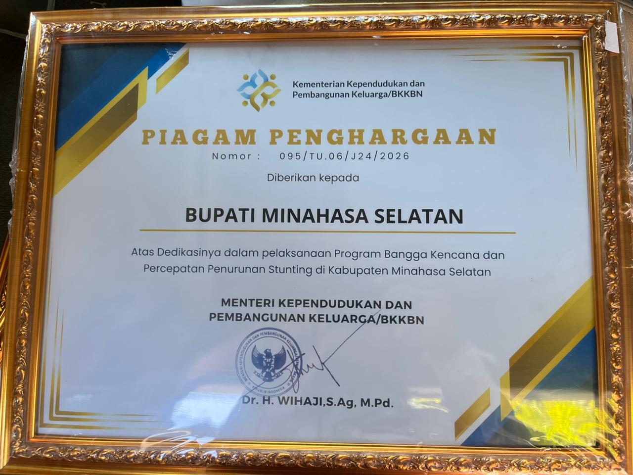 3. Piagam Penghargaan diberikan kepada Bupati Minahasa Selatan atas dedikasinya dalam pelaksanaan program bangga kencana dan percepatan penurunan stunting di kabupaten Minahasa Selatan