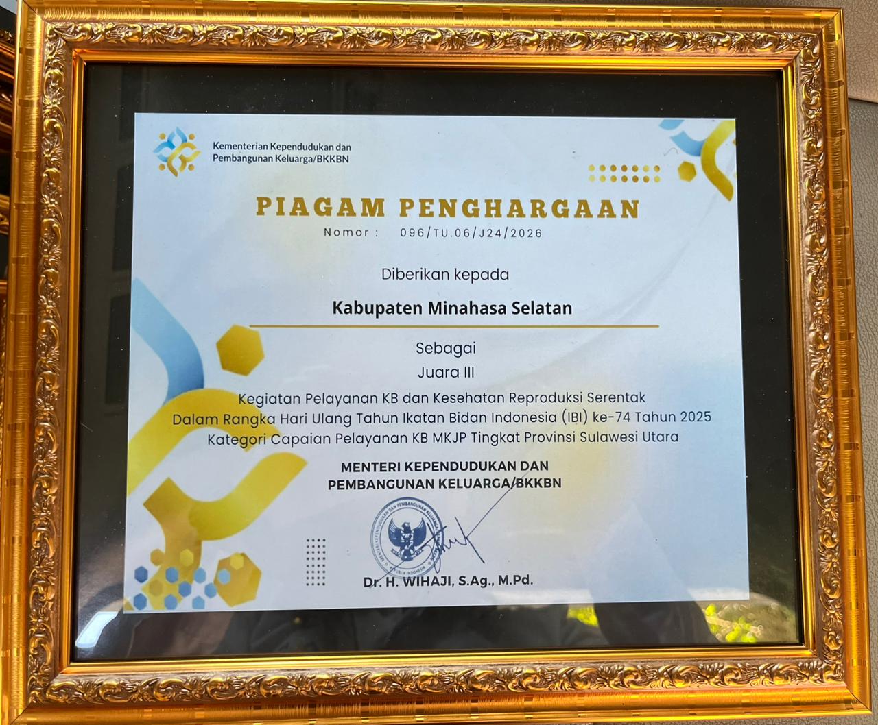 4. Piagam Penghargaan diberikan kepada Kabupaten Minahasa Selatan Sebagai Juara III Kegiatan Pelayanan KB dan Kesehatan Reproduksi serentak dalam rangka hari ulang tahun Ikatan Bidan Indonesia (IBI) ke – 74 Tahun 2025 Kategori capaian pelayanan KB MKJP Tingkat Provinsi Sulawesi Utara
