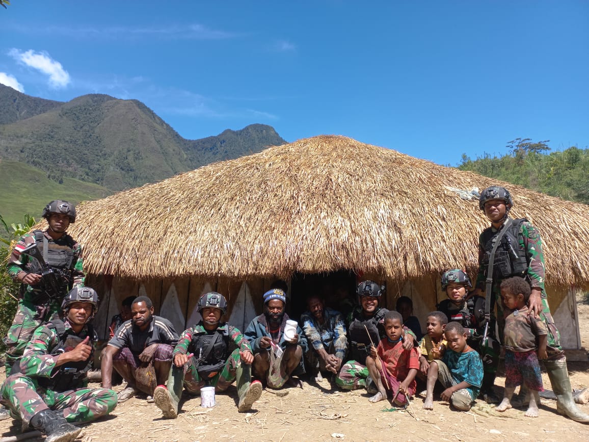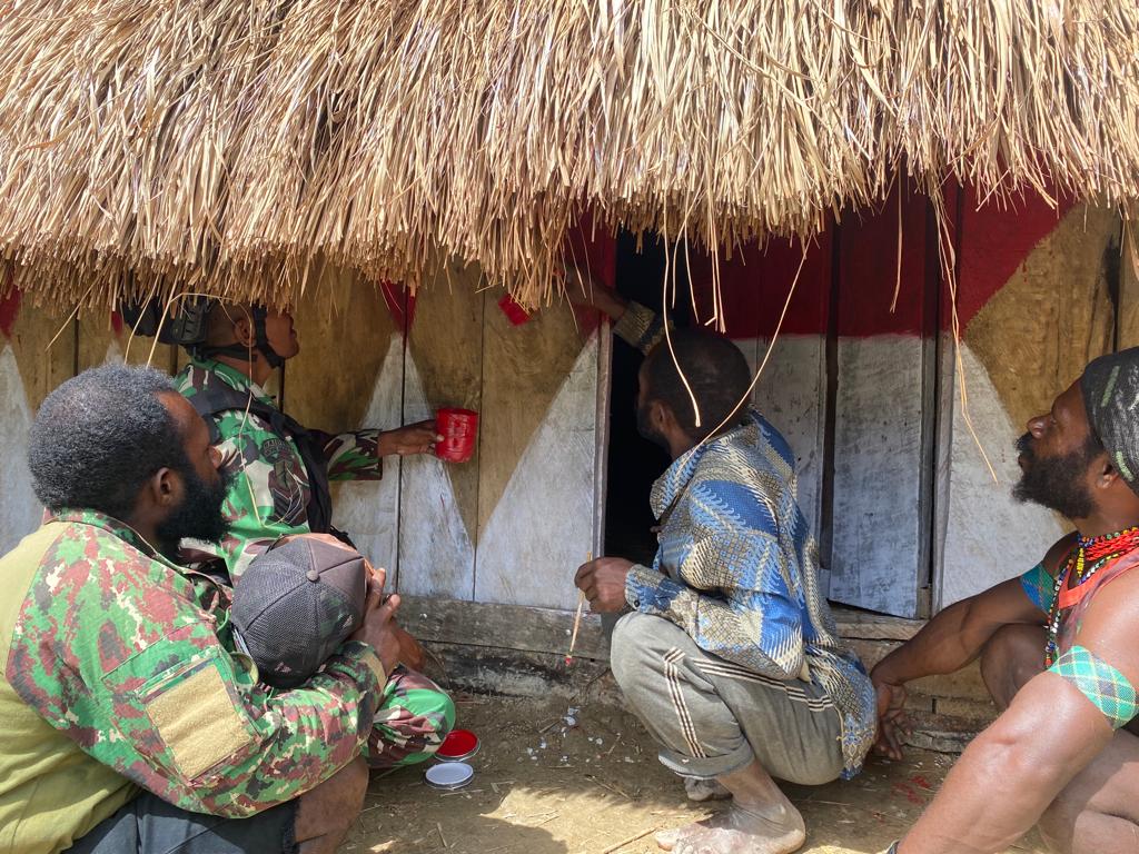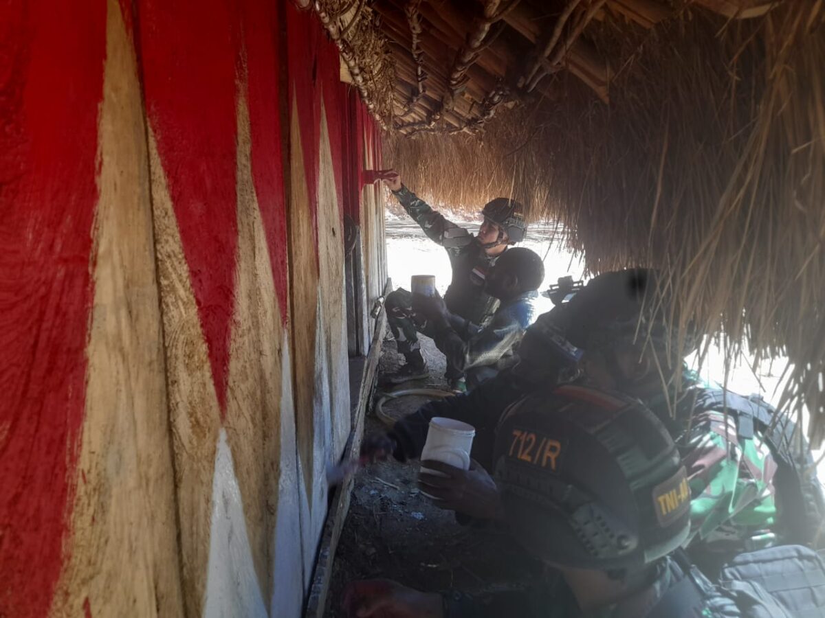 Pilarportal.com – Papua – Hari Senin pagi yang cerah di Distrik Kalome, Kab. Puncak Jaya, Papua terlihat beberapa warga kampung dan anggota Satgas Pamtas RI-PNG Kewilayahan Yonif R 712/Wiratama dari Posramil Kalome secara kompak dan telaten mengecat sebuah honai (rumah adat) tradisional dengan warna dasar bendera Negara Kesatuan Republik Indonesia yaitu merah dan putih. (Senin, 22 Mei 2023)