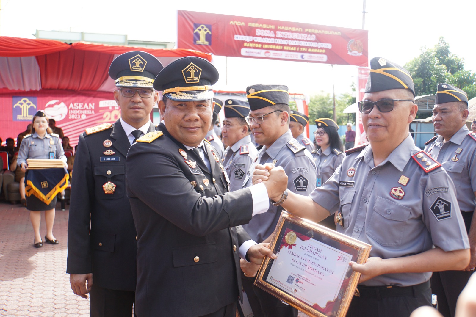Kepala Lapas Klas IIB Tondano, Yulius Paath terima langsung penghargaan yang diserahkan oleh Kepala Kantor Wilayah Kementerian Hukum dan HAM Sulawesi Utara, Ronald Lumbuun disaksikan oleh Kepala Divisi Administrasi, John Batara, Kepala Divisi Pemasyarakatan, I Putu Murdiana, Kepala Divisi Keimigrasian, Friece Sumolang, Kepala Divisi Pelayanan Hukum dan HAM, Rudy H Pakpahan dan tamu undangan yang hadir memenuhi Halaman Depan Kantor Imigrasi Kelas I TPI Manado., Penyerahan penghargaan dilangsungkan pada acara syukuran Hari Kemenkumham ke-78.