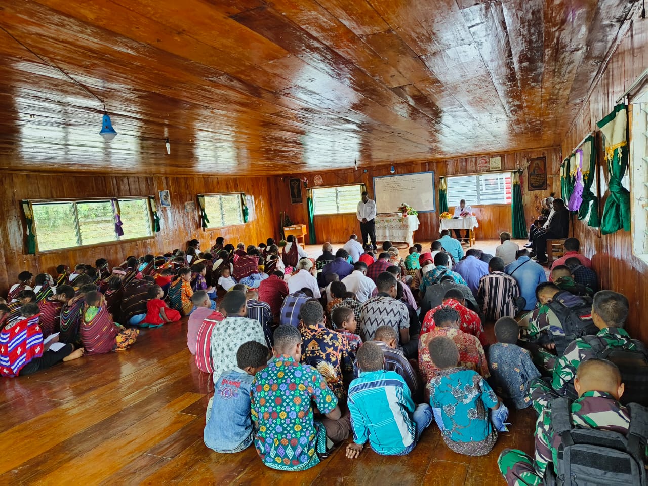“Tuhan Yesus memberkati semua masyarakat, semua teman-teman TNI disini dari pos satgas, semua Jemaat Gereja Wandenggobak. Kami anak-anak Tuhan disini berkumpul sama-sama untuk puji Tuhan Yesus Kristus, jadi setiap Minggu warga datang sama-sama untuk peribadatan.” Ungkap Bapak Telangga Gire selaku salah satu Pendeta di gereja tersebut. (*/chris)