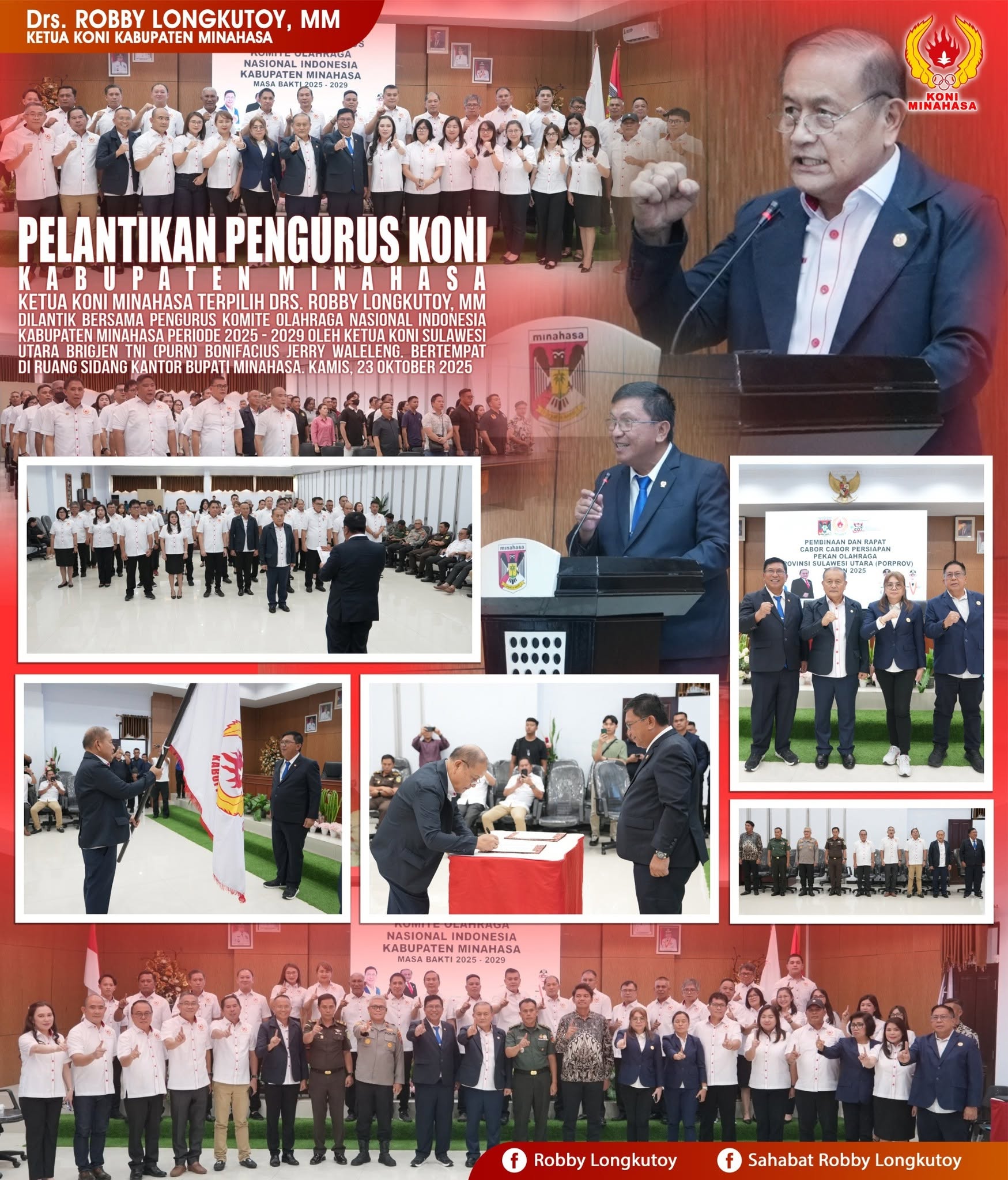 Pilarportal.com,Minahasa – Komite Olahraga Nasional Indonesia (KONI) Minahasa resmi memiliki kepengurusan baru. Pengurus KONI Minahasa masa bakti 2025-2029, yang dipimpin oleh Ketua DPRD Minahasa Drs Robby Longkutoy MM, dilantik secara resmi oleh Ketua KONI Sulawesi Utara Brigjen B Jerry Waleleng SE pada Kamis (23/10/2025).