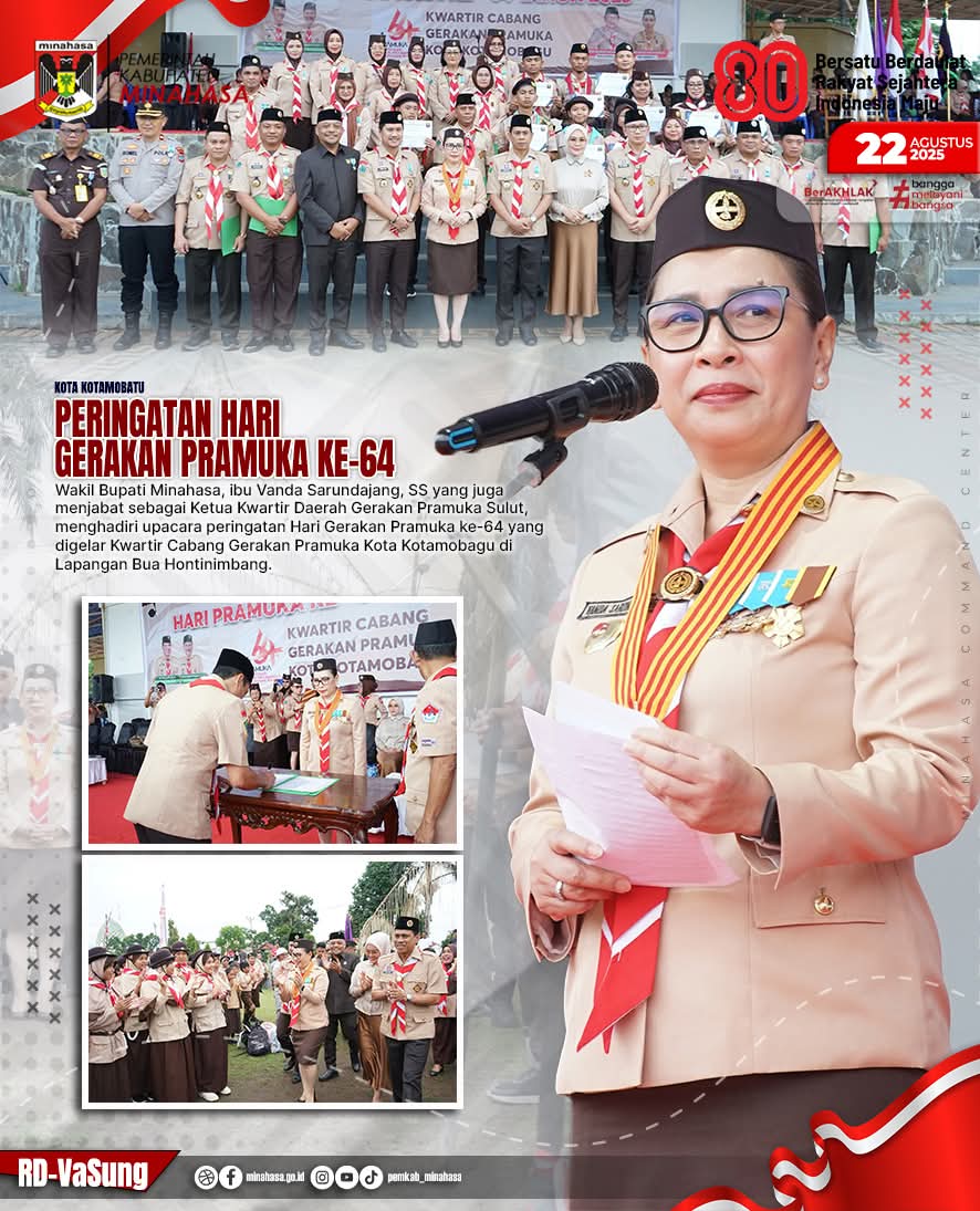 Pilarportal.com,Kotamobagu, – Pemandangan luar biasa tersaji di Lapangan Bua Hontinimbang, Kotamobagu, saat Wakil Bupati Minahasa, Vanda Sarundajang, SS, yang juga merupakan Ketua Kwartir Daerah (Kwarda) Gerakan Pramuka Sulawesi Utara, memimpin upacara peringatan Hari Gerakan Pramuka ke-64 pada Jumat, 22 Agustus 2025.