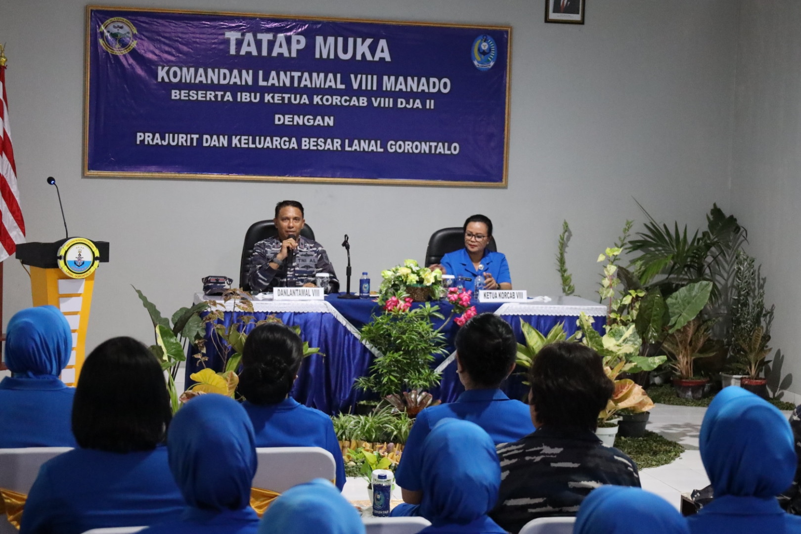 Danlantamal VIII selanjutnya menuju Aula Gedung Payungga, untuk bertatap muka dengan prajurit dan keluarga besar Lanal Gorontalo. Pada kesempatan tersebut Danlantamal VIII didampingi Ketua Korcab VIII DJA II, menyampaikan beberapa penekanan diantaranya lebih bijak dalam bermedia sosial, tidak terlibat dalam politik praktis, menghindari perbuatan tercela dan melanggar hukum sehingga dapat merugikan diri sendiri dan institusi. Selain itu agar menciptakan iklim kebersamaan, kekeluargaan dan kerja sama yang harmonis di lingkungan staf.