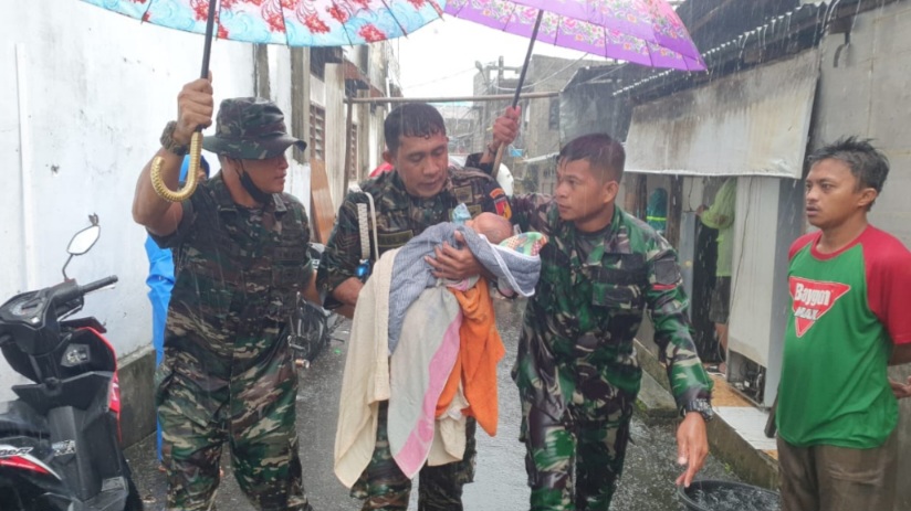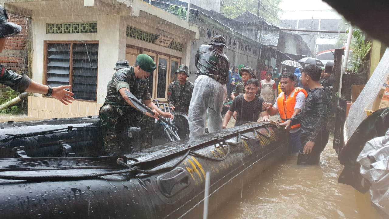 Prajurit Kodam XIII/Merdeka yang tergabung dalam Tim Terpadu Bencana Alam dengan tanggap dan sigap langsung turun ke lokasi bencana menuju sasaran mendekati rumah – rumah warga yang sudah terperangkap banjir dilengkapi perahu LCR untuk mengevakuasi korban banjir, salah satu lokasi banjir terjadi di wilayah Komo Dalam, Dendengan Luar Kecamatan Wenang Kota Manado. Jumat (27/1/2023).