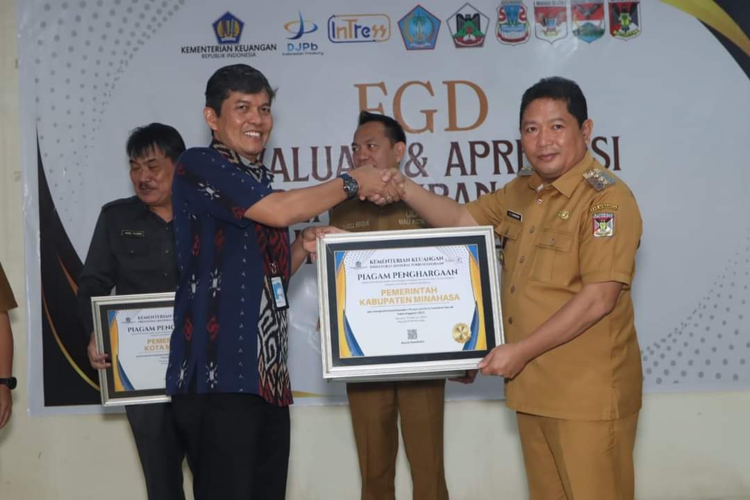 Penghargaan tersebut diserahkan langsung Kepala KPPN Manado Asep Syaefudin kepada Penjabat Bupati Minahasa, Dr. Jemmy Stani Kumendong, M.Si didampingi Sekda, Dr. Lynda Watania, MM, MSi serta Kepala Badan Aset dan Pengelolaan Keuangan Daerah Minahasa, Joice M. Pua, SE dalam kegiatan FGD dan Aspirasi Penyaluran TKD tahun 2023, di gedung KPPN Manado, Selasa, (27/02/2024).