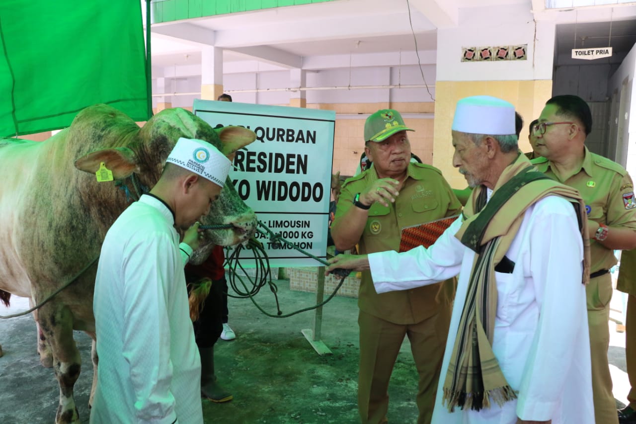 Pilarportal.com, Minahasa – Wakil Bupati Minahasa Dr. (HC) Robby Dondokambey (RD) SSi, MM, MAP, menyerahkan sapi kurban Presiden Joko Widodo di Masjid Agung Al-Falah Kiai Modjo Kelurahan Kampung Jawa Tondano Utara, Selasa (27/06/2023).
