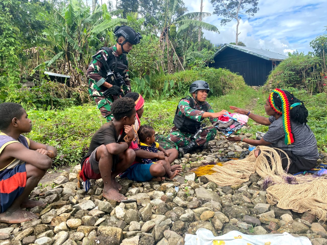 Berbekalkan beberapa baju dan kaos baru sebagai sargal, anggota satgas membagikan kepada warga yang ditemui selama perjalanan. Nampak beberapa anak-anak dan orang bersukacita. Mereka juga langsung memakai baju dan kaos dari satgas.
