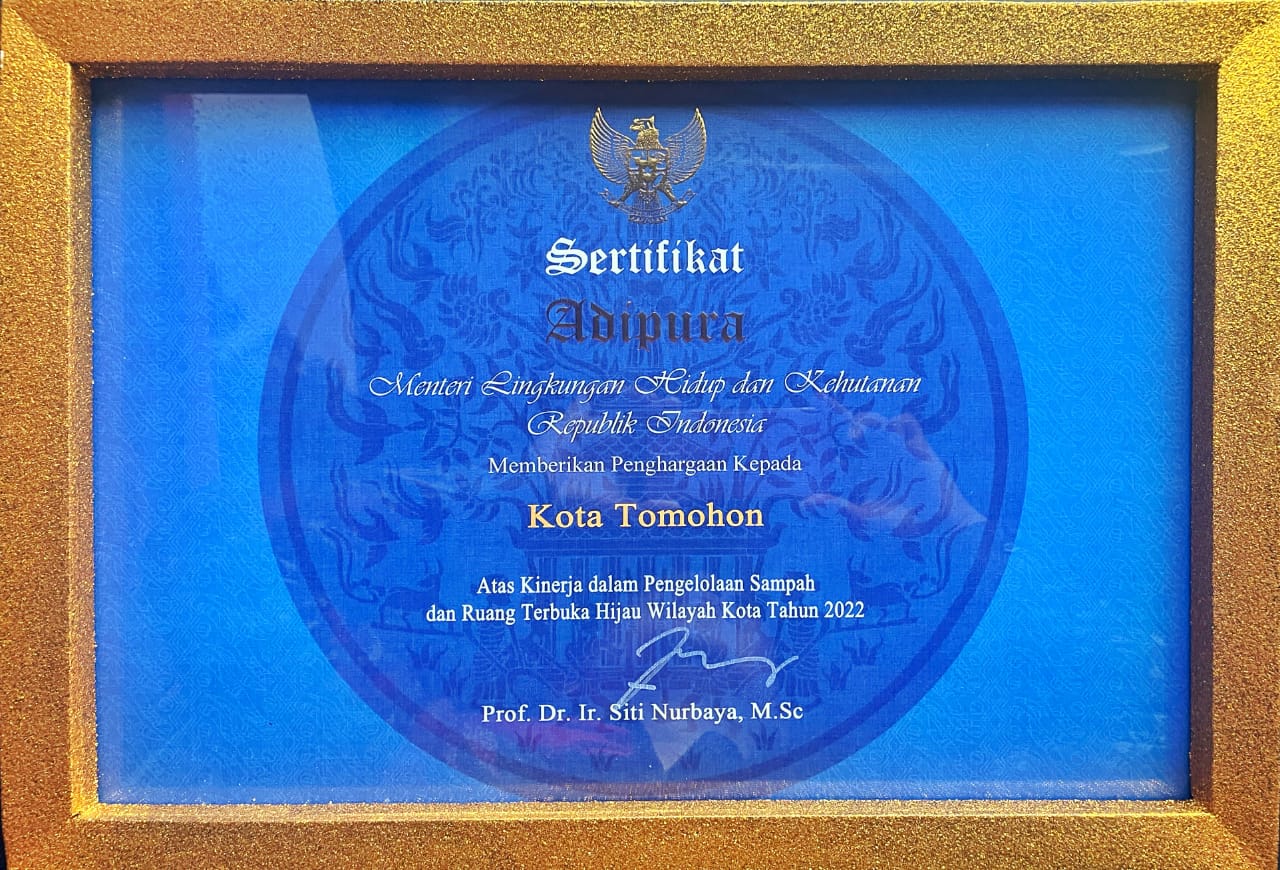 Penghargaan  Sertifikat Adipura diterima Walikota Tomohon Caroll J A Senduk SH, diserahkan oleh Menteri Lingkungan Hidup dan Kehutanan Dr Ir Siti Nurbaya MSc, dalam acara penganugerahan penghargaan Adipura 2022 serangkaian kegiatan peringatan Hari Peduli Sampah Nasional (HPSN) yang digelar di Auditorium Dr Sudjarwo, Gedung Manggala Wanabakti, Jakarta. Selasa (28/02/2023).