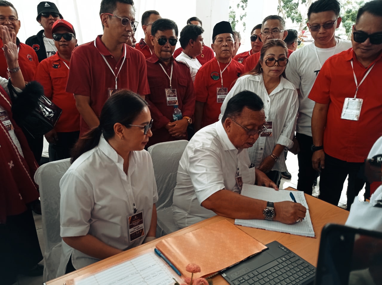Pilarportal.com,Minahasa – Pasangan Calon (Paslon) Bupati dan Wakil Bupati Minahasa dari PDI Perjuangan Robby Dondokambey – Vanda Sarundajang (RD – Vasung) menuju Kantor KPU Minahasa, Kamis (29/08/2024).