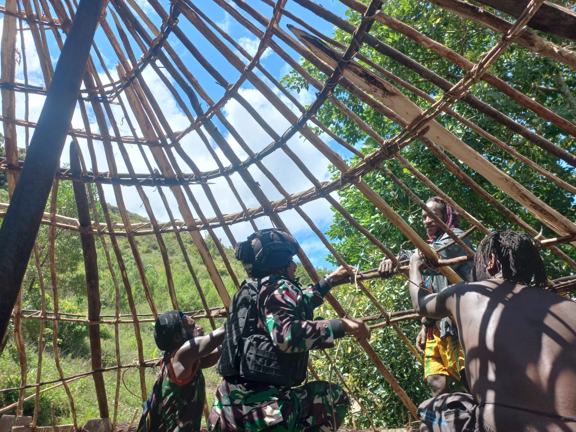 Pilarportal.com – Papua – Bulan suci Ramadhan tahun ini diisi dengan banyak kegiatan positif dan inovatif oleh para prajurit yang tergabung dalam Satgas Pamtas RI-PNG Kewilayahan Yonif Raider 712/Wiratama. Salah satu bentuk kegiatannya yaitu membantu masyarakat Papua membuat Honai ( Rumah tradisional khas Papua ) di Distrik Kalome, Kabupaten Puncak Jaya, Papua. (Kamis, 30 Maret 2023)