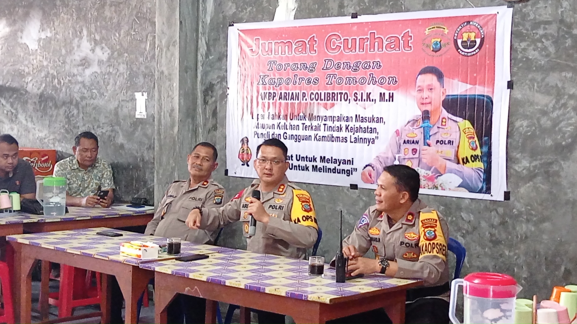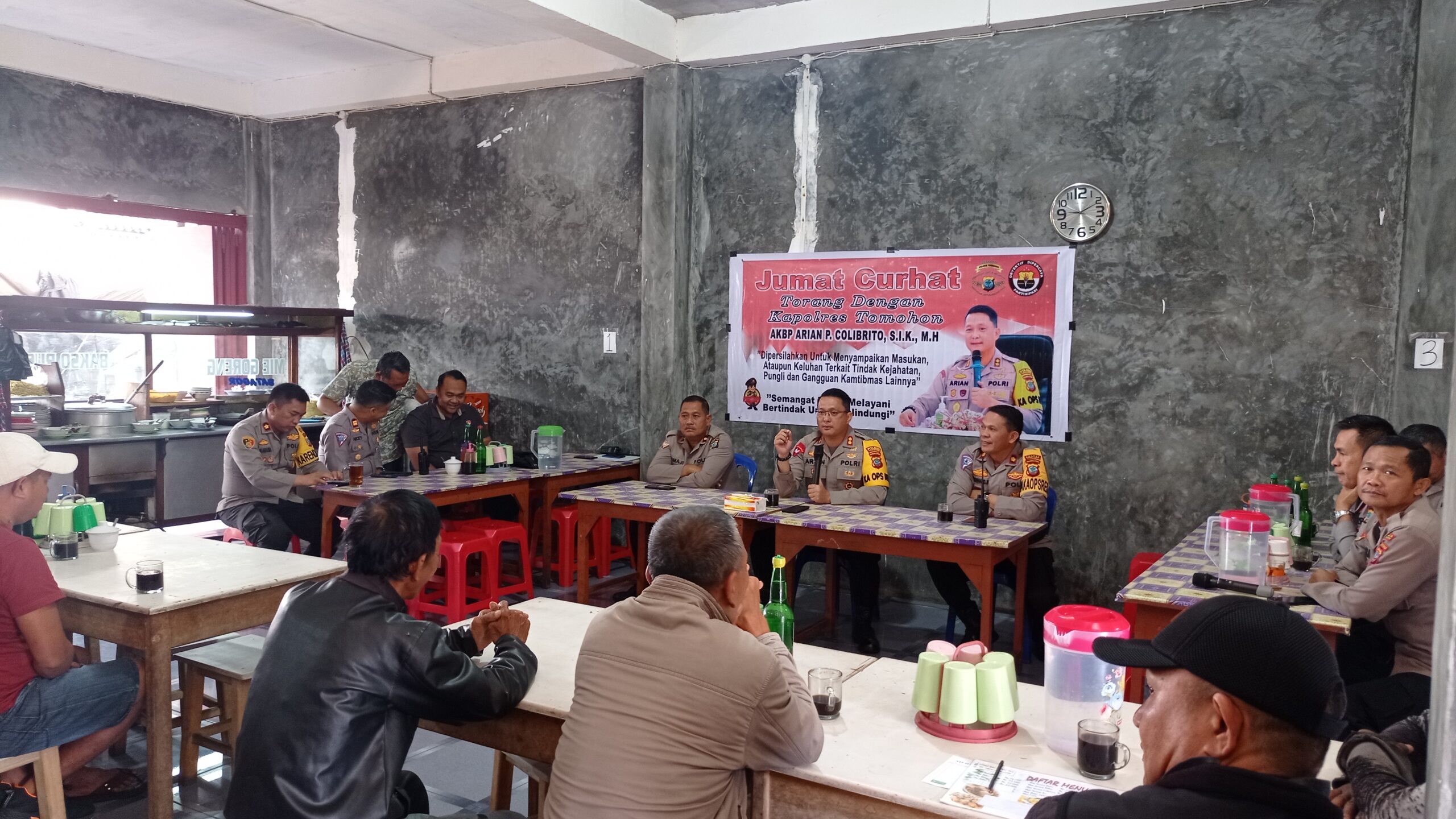 Kapolres Tomohon AKBP Arian Primadanu Colibrito SIK MH menghadiri langsung kegiatan Jumat Curhat yang diadakan di Kedai Bakso Mas Mul, Kecamatan Tomohon tengah.