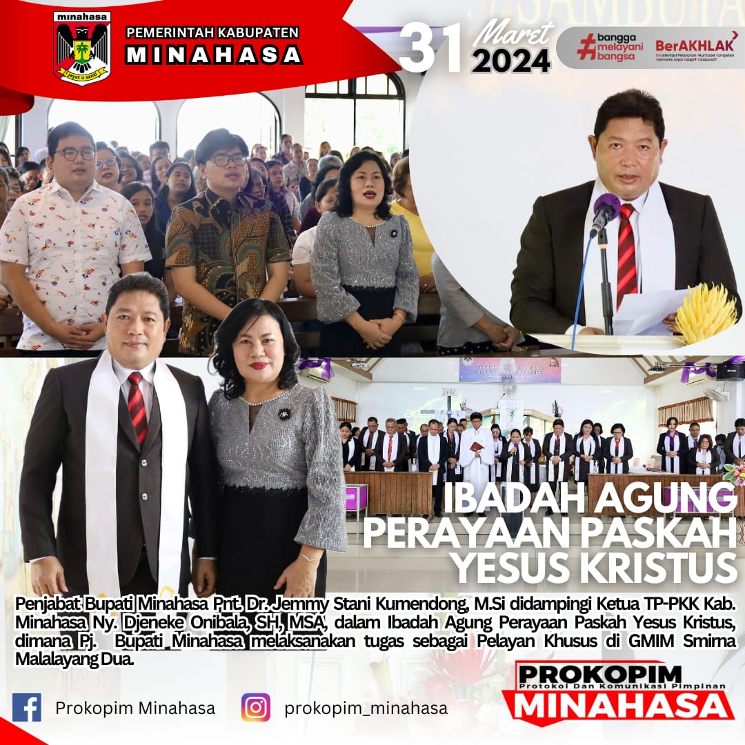Pilarportal.com,Minahasa – Penjabat Bupati Minahasa Dr. Jemmy Stani Kumendong MSi, bersama penggerak PKK Kabupaten Minahasa, Ny Djeneke Onibala, SH MSH. mengikuti ibadah Paskah di jemaat GMIM Smirna Malalayang Dua, Minggu (31/03/2024) Manado.
